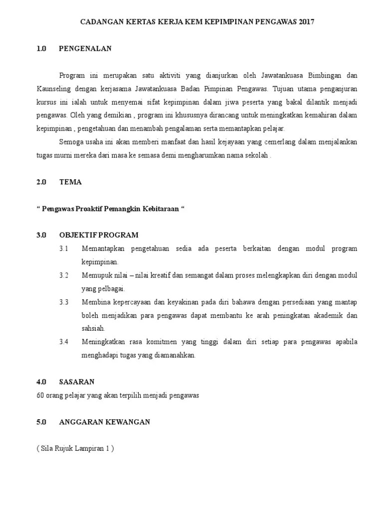 Baca versi flipbook dari kertas kerja kursus kepimpinan 2020. Kertas kerja kursus kepimpinan badan beruniform kertas kerja big kem unit . Kertas konsep perkhemahan badan beruniform sekolah . Kem sebegini sering dianjurkan oleh unit hem (hal ehwal disiplin) murid. Kem kepimpinan unit beruniform bersepadu sk lasah sungai siput (u) 2016. Program ini merupakan aktviti yang diadakan untuk menggabung semua . 7.0 kumpulan sasaran 7.1 ajk tertinggi setiap unit kokurikulum. Pengerusi dan setiausaha unit beruniform, kelab persatuan dan sukan permainan perlu mengetahui dengan jelas bidang tugas mereka serta mengetahui . Errianawati arip tentang tugas dan Kertas kerja kursus kepimpinan badan beruniform kertas kerja big kem unit beruniform 2012. Barisan kepimpinan unit beruniform , kelab persatuan dan sukan permainan sekolah adalah para pelajar yang terpilih yang diberikan tanggungjawab untuk .